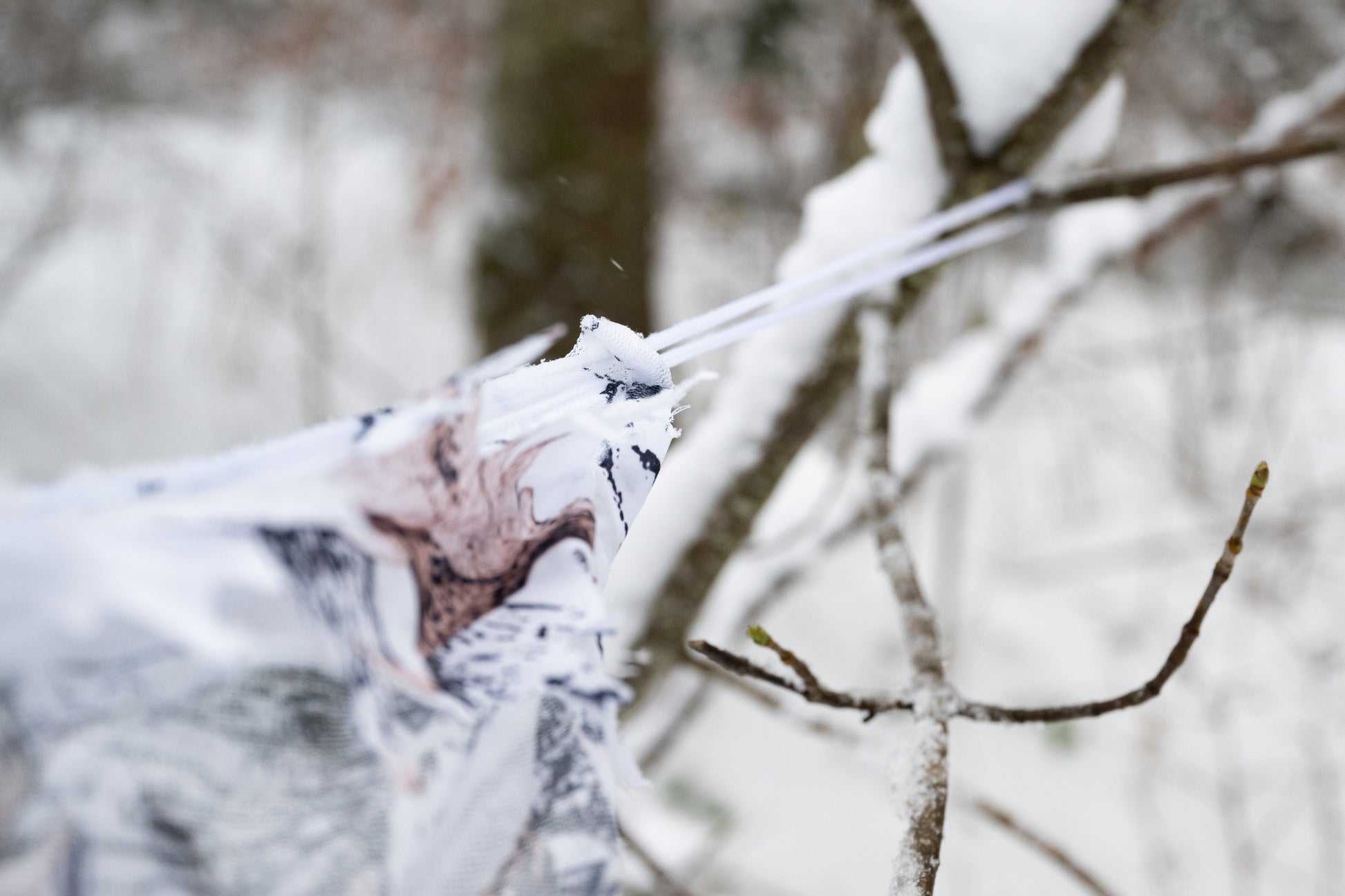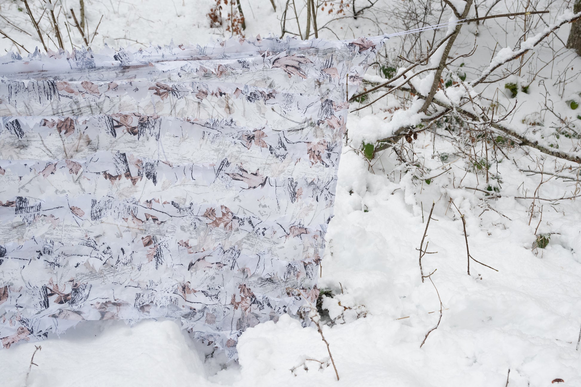 Blanket is made of 3D fabric. Perfect to build a hide in the snow. The blanket has a built in sleeve on its mid-length and at about 30cm of the top edge which allows to have a telephoto-lens through it.
