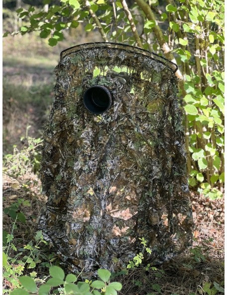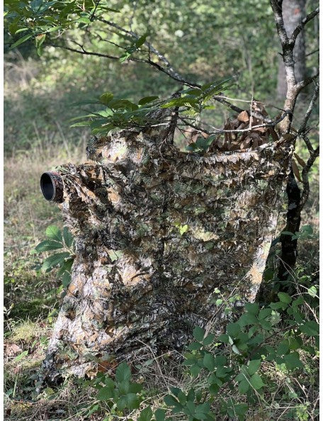 The 3D camouflage net is ideal for woodlands because its texture imitates the look of foliage. It includes a sleeve for your lens and a semi-transparent section above your camera to help you better observe your surroundings. This section can be stowed away for full visibility if you wish.